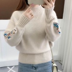 ROYALBELLE 여성 하프넥 소프트 자수 스웨터 밑단 밴딩 쇼트핏 빈티지 패션 니트 티셔츠 K0101015